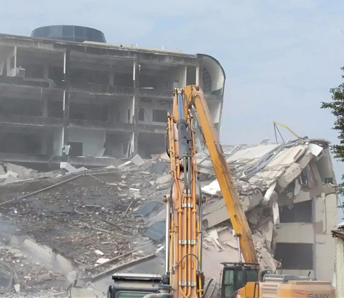 3. 逐層拆除:自上而下逐層拆除每一層的墻體、樓板和柱子。在拆除每一層時,先拆除樓板,然后拆除墻體和柱子。